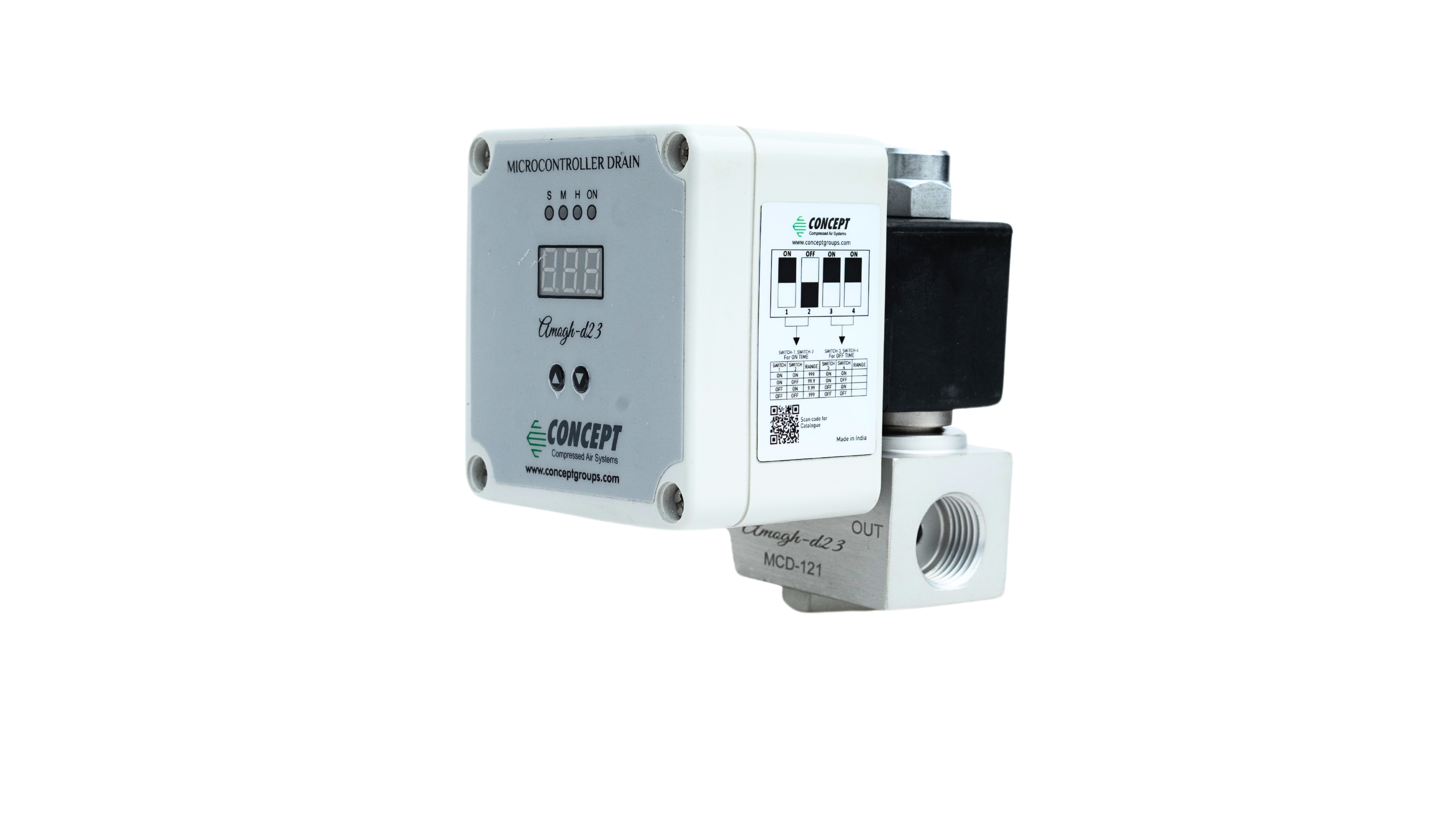Optimize your compressed air system with the Amogh-dd-23 Microcontroller Auto Drain, a smart and durable solution for automated drainage. Equipped with a 3-digit 7-segment LED display, it offers user-friendly time settings (ON time: 0-999 S/M/H, OFF time: 0-999 S/M/H). Its IP65 polycarbonate enclosure ensures weatherproof protection, while customizable valves (Aluminum, Brass, SS 304/316) and multiple connection sizes (¼" to 1") make it adaptable to various industrial applications. Suitable for high-pressure operations (up to 70 Kg/cm²), this auto drain is the ultimate choice for efficient and reliable performance.