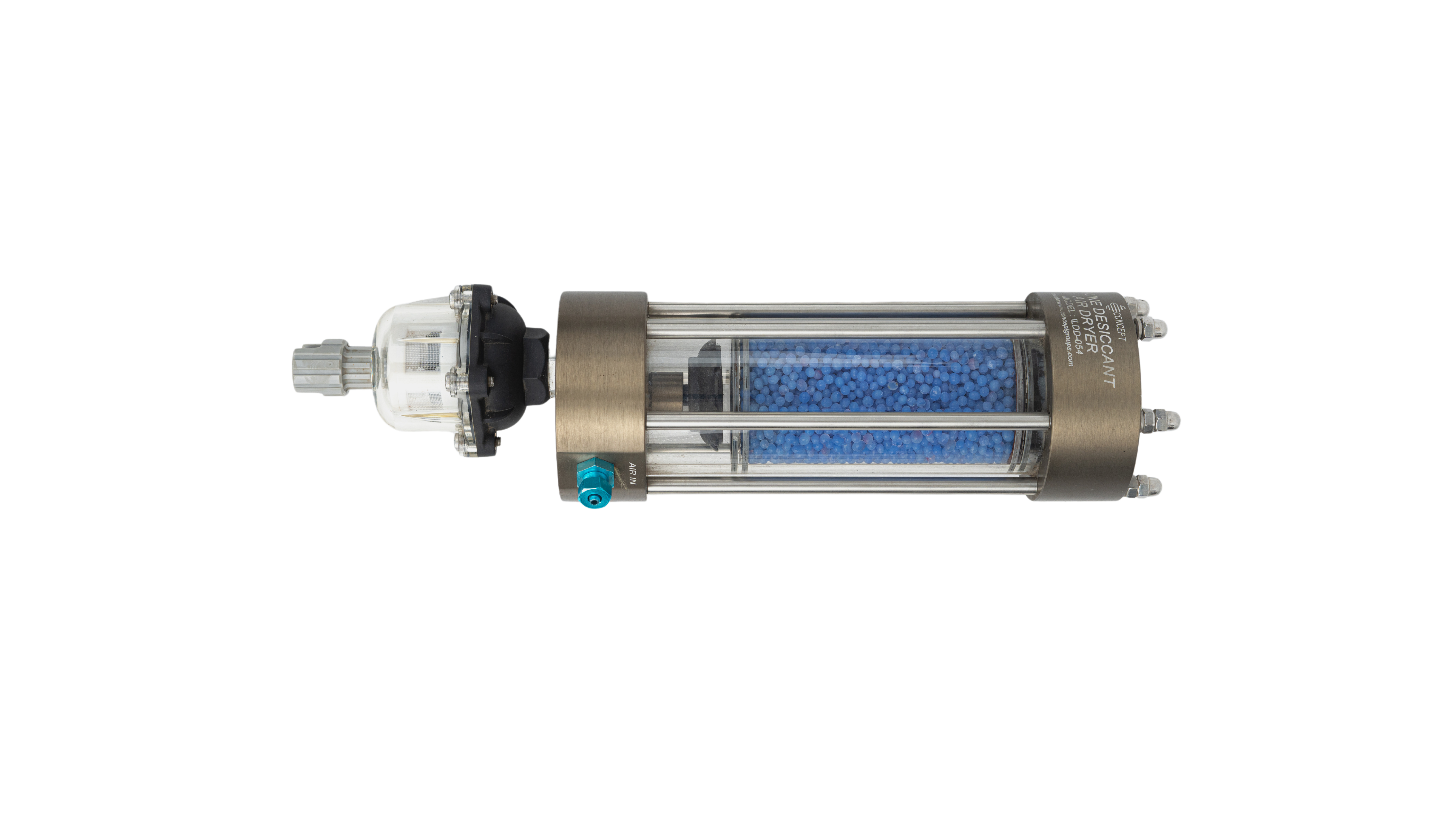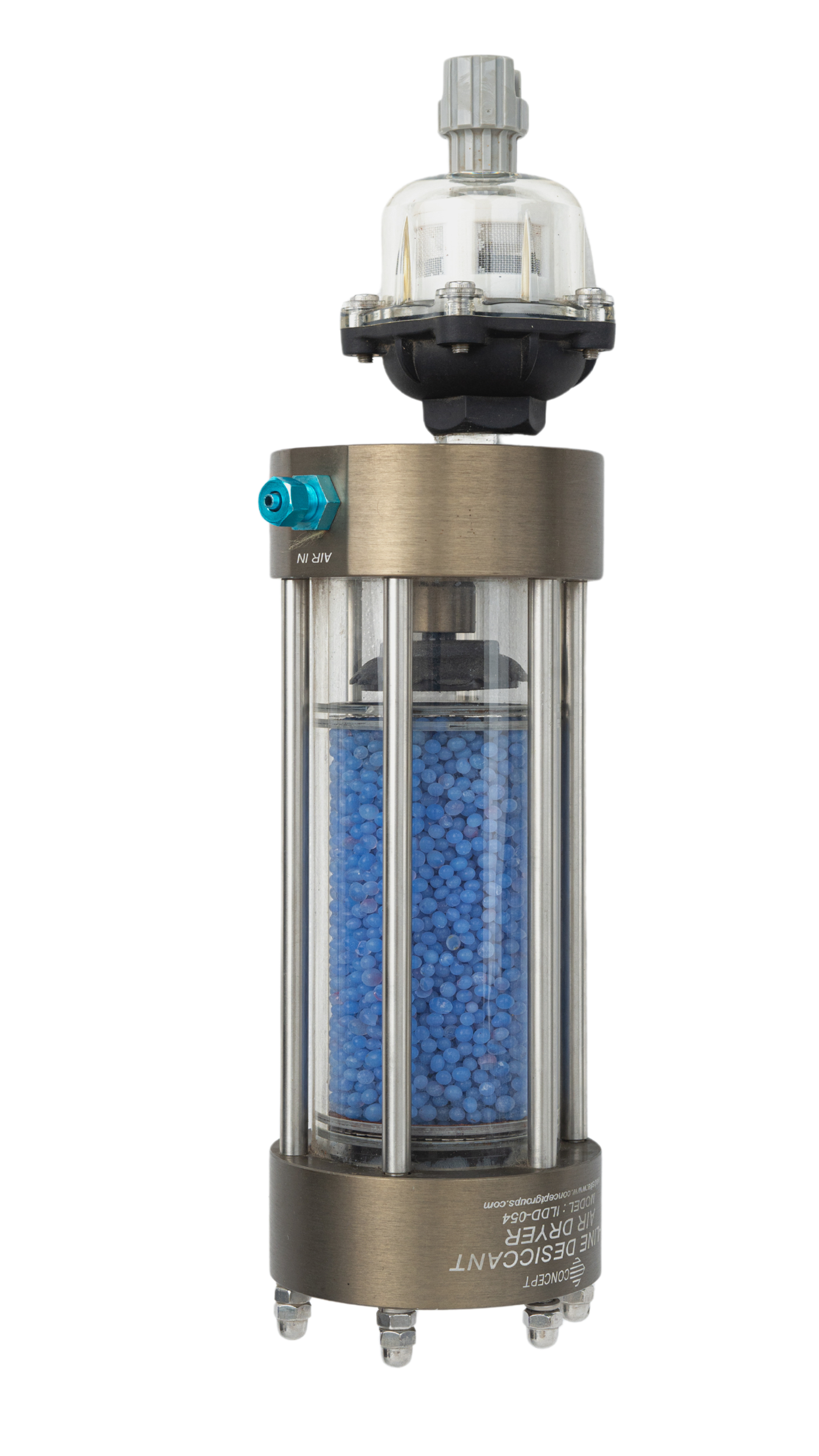 The compressed air flow through the bottom of the dryer and distributed uniformly and passed through the desiccant bed. The moisture is drained at the bottom either with manual drain or automatic drain valve (optional).